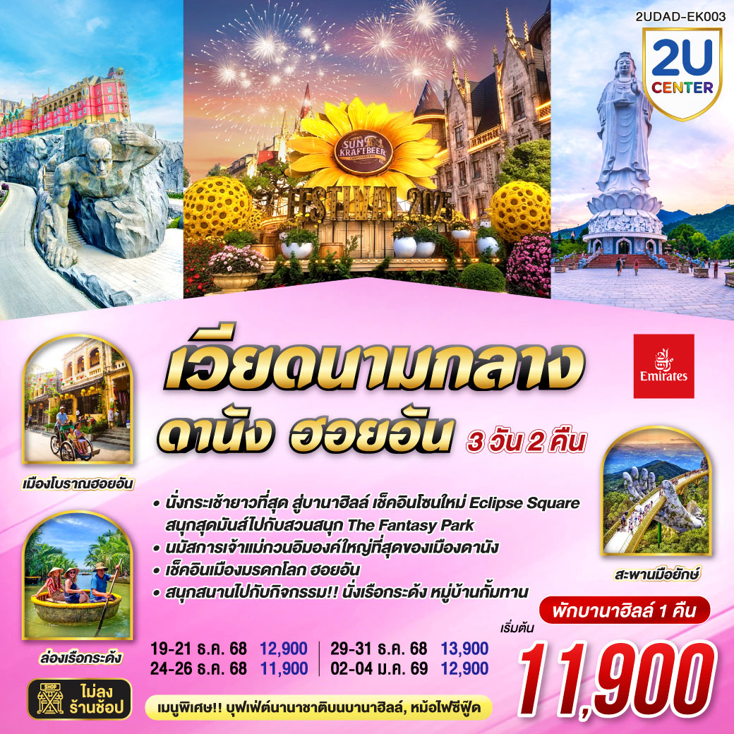 | 3 | บานาฮิลล์ – เมืองโบราณฮอยอัน – ล่องเรือกระด้ง หมู่บ้านกั๊มทาน – ถ่ายรูปสะพานมังกร – สวน APEC – ตลาดฮาน – ท่าอากาศยานนานาชาติดานัง (EK371: 23.30 – 01.10+1) – กรุงเทพฯ (ท่าอากาศยานนานาชาติสุวรรณภูมิ) *เมนูพิเศษ หม้อไฟซีฟู๊ด | ✔ | ✔ | ✔ |