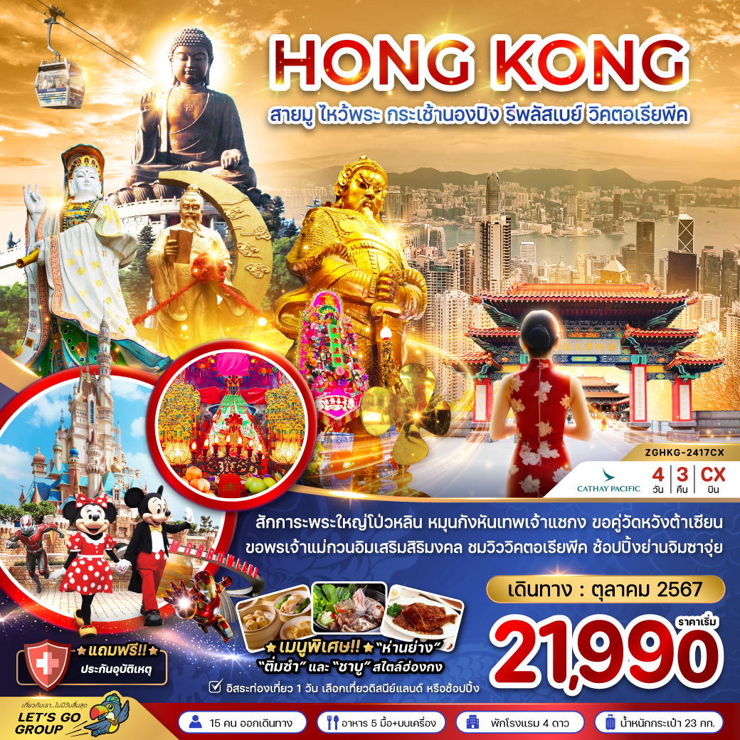 | 4 | รีพลัส เบย์ – วิคตอเรียพีค - กระเช้าลอยฟ้านองปิง 360 องศา – วัดโป่วหลิน – พระใหญ่เทียนถาน หมู่บ้านวัฒนธรรมนองปิง - ห้างซิตี้เกต เอาท์เล็ท – สนามบินนานาชาติฮ่องกง - สนามบินสุวรรณภูมิ | ✔ | ✘ | ✘ |